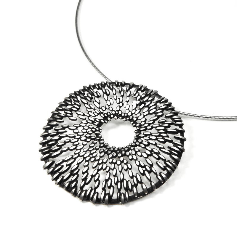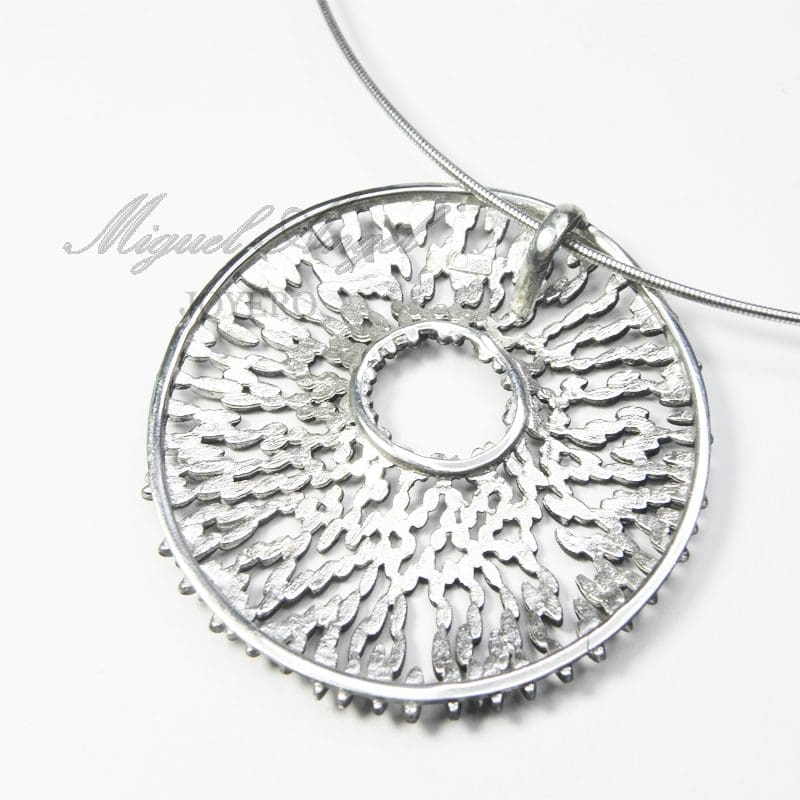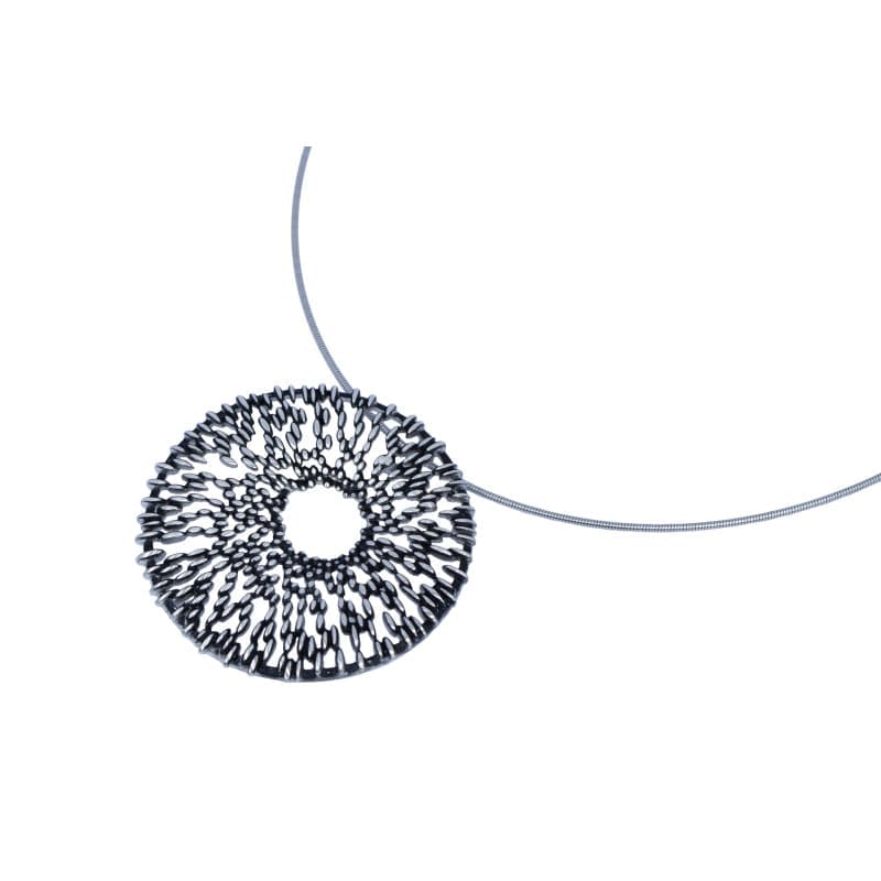 Compuesto por pieza circular imaginando una lluvia continua de 4,6 cm de diámetro, con pigmentos naturales en varias tonalidades .(consultar) y collar de acero muelle de 1,1 mm 1 hilo de 40,5 cm terminales y reasa en plata 925.