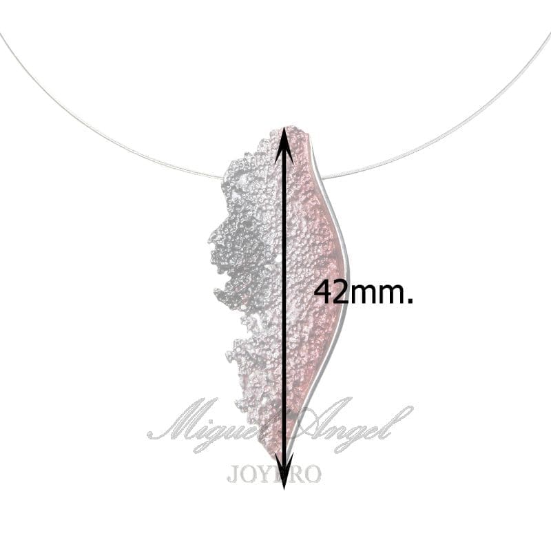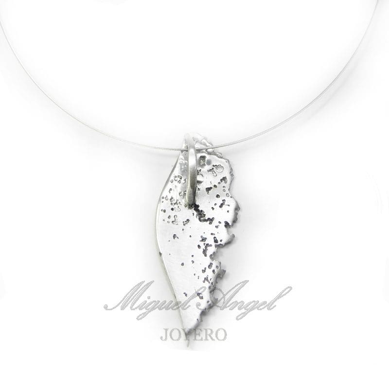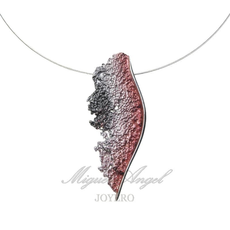 Compuesto por pieza 42 x 19 mm. en óxido con pigmento, disponible en varios colores.(consultar), línea lateral en plata brillo, con collar acero 1 hilo de 42 cm con terminales y reasa en plata 925.