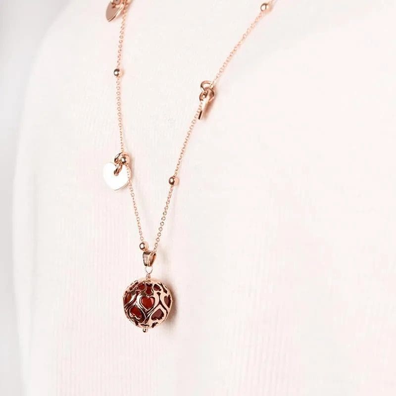 COLLAR EN BRONCE BAÑADO DE ORO ROSA CON CORAZONES Y BOLA BURDEOS